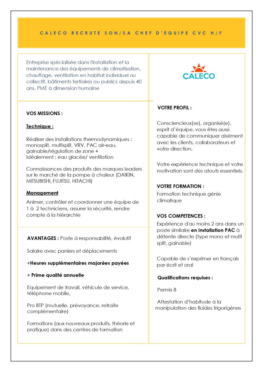 Chef d’équipe installateur- monteur Chauffage- Climatisation (CVC) H/F en CDI