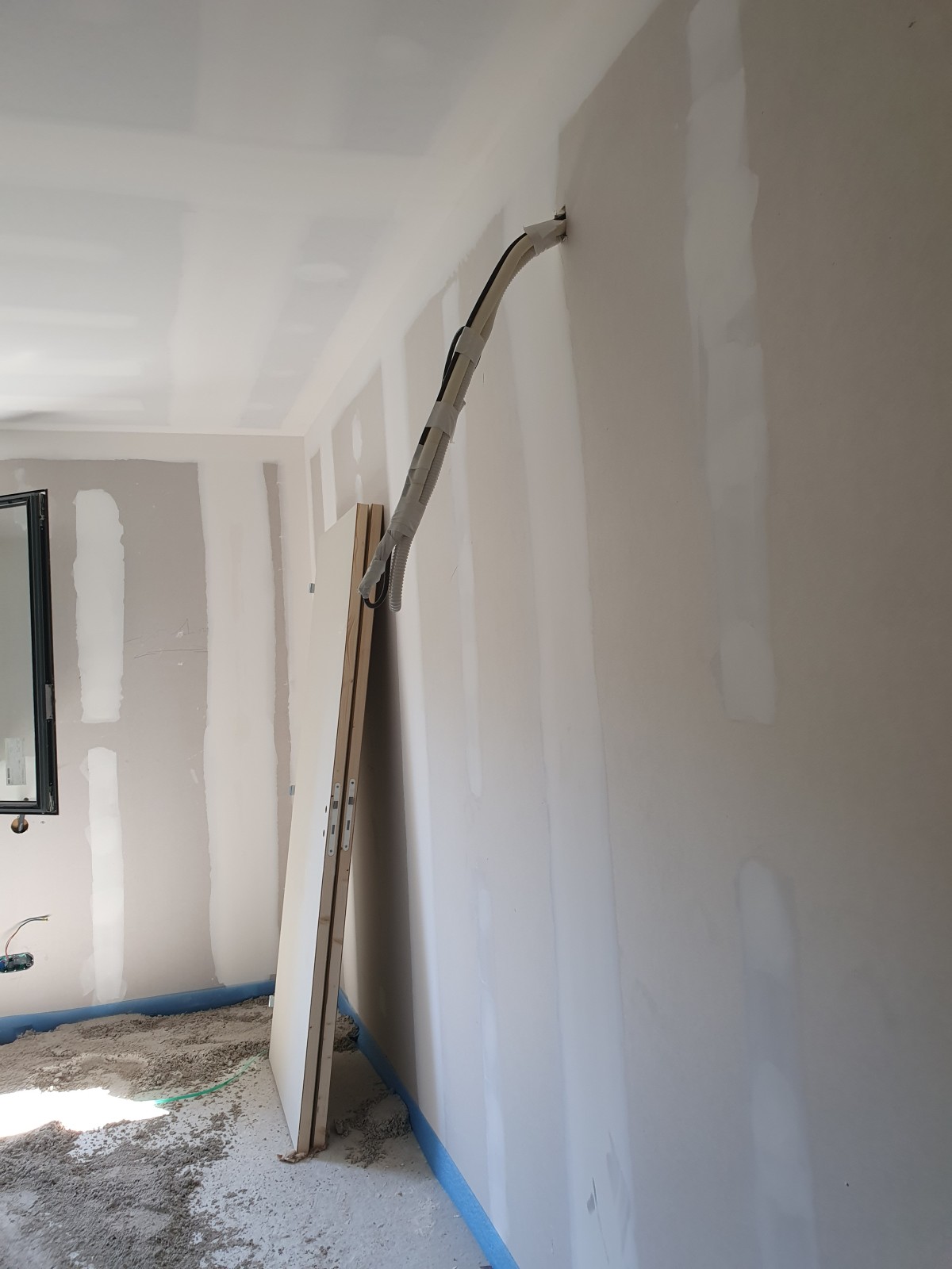 Les équipes CALECO ont réalisé un premier pré équipement de pompe à chaleur air-air qui consiste à passer les liaisons frigorifiques, les condensats et à installer l'unité intérieure gainable qui va chauffer le salon et la chambre parentale avant la fermeture des placo. Une mise sous azote des circuits frigorifiques permet d assurer leur étanchéité.