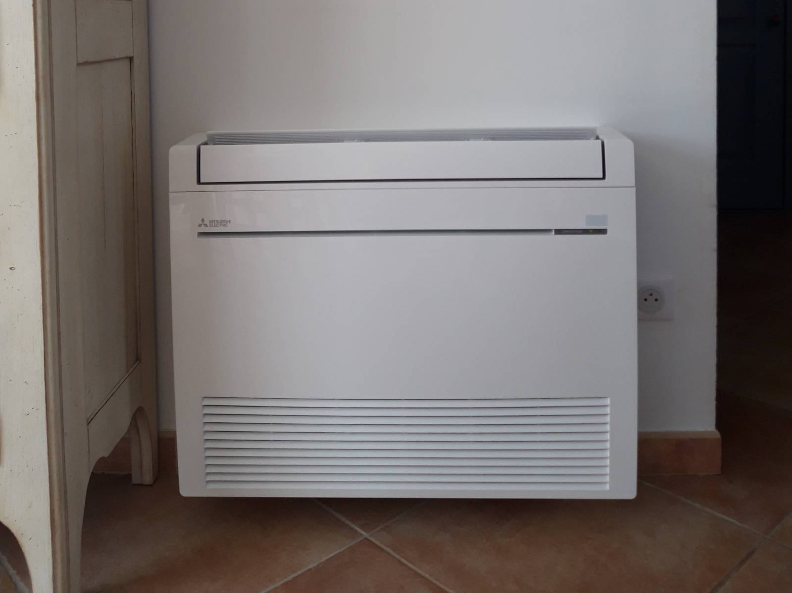 Pour cette maison située à Gonfaron dans le VAR 83, la console de 5KW MITSUBISHI ELECTRIQUE SUZ-M50VA ET MFZ-KT50VG est idéale afin de chauffer et rafraichir efficacement un grand salon.