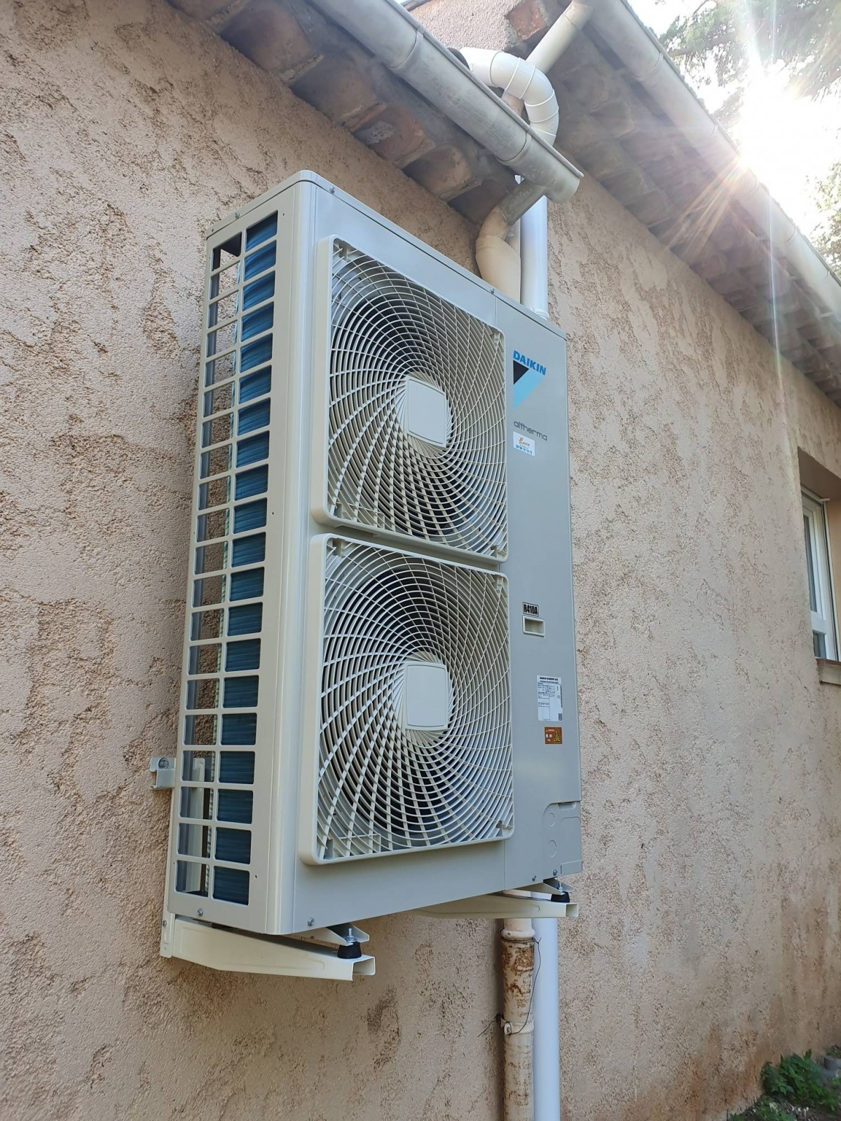 remplacement chaudière fioul par une pompe à chaleur air eau daikin haute température alimentant un ballon pressurisé de 300l pour la production ecs avec attente panneau solaire dualsun dans une villa à Hyeres var .