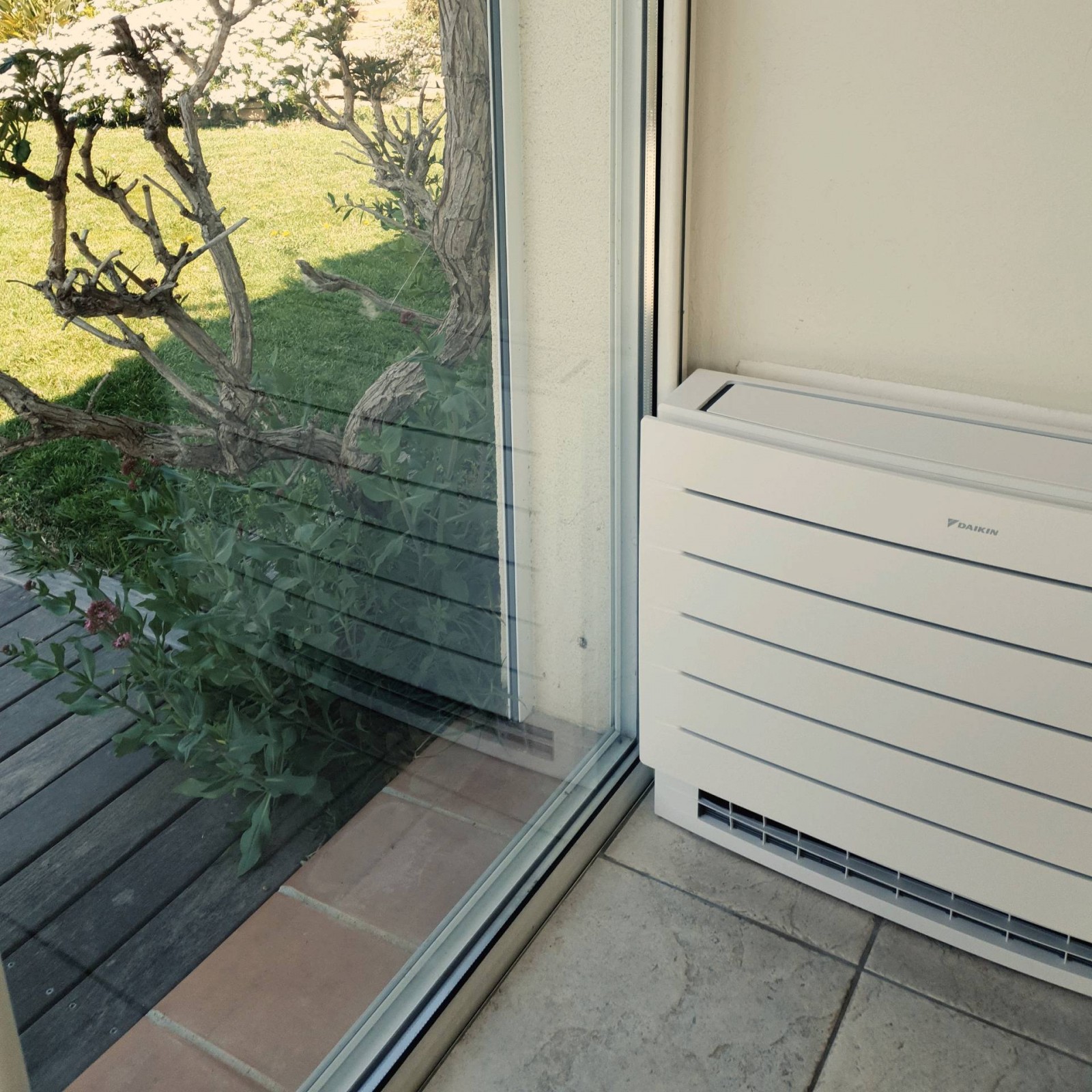 Pour chauffer et climatiser un grand sejour-salle à manger et une cuisine, les liaisons frigorifiques ont été conservées et trois consoles FVXM25A et un groupe extérieur 3MXM53N8 AU GAZ R32 ont remplacé à l identique les anciens appareils pour plus de discrétion.